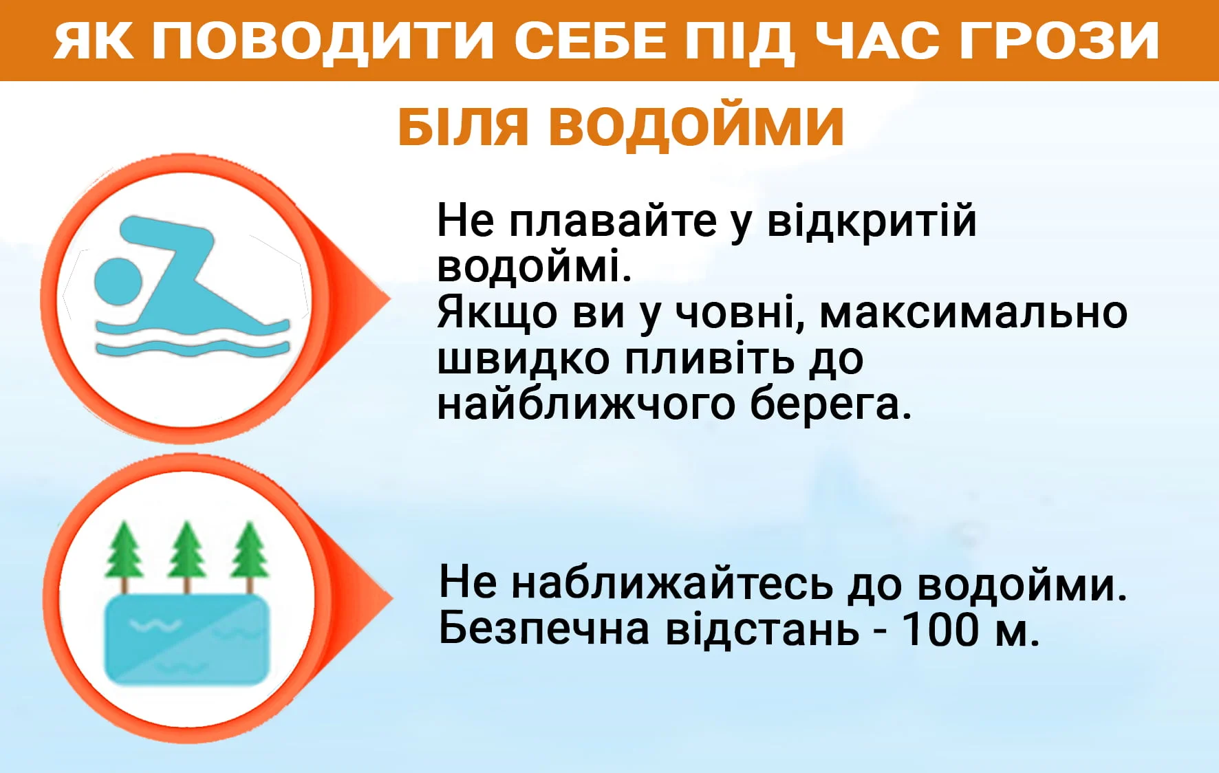 – Не можна купатись під час грози, але якщо гроза застала під час купання, то слід до берега добиратися повільно, спокійно, не вимахуючи руками. – Перебуваючи в горах, уникайте різних виступів і підвищень.