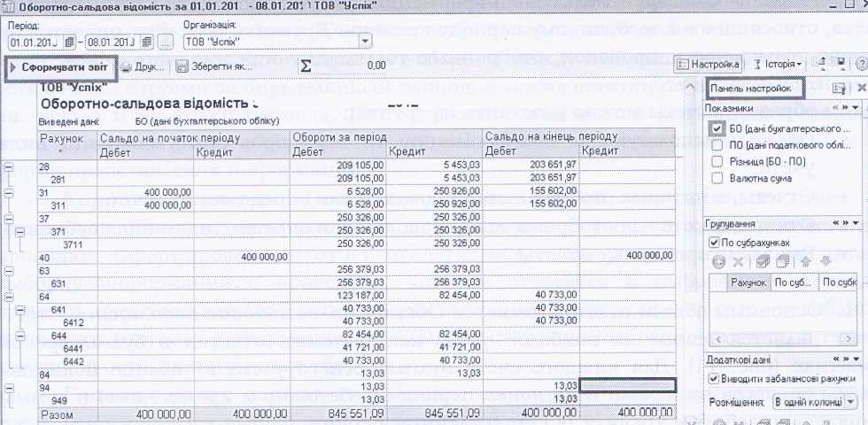 Щоб у звіті показувались субрахунки ставимо галочку у вкладці «Групування», навпроти значення «По субрахунках».