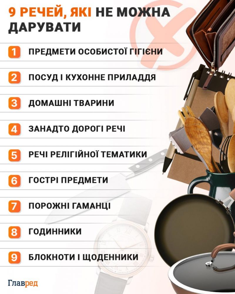 Також в давнину вірили: цей предмет приносить нещастя в дім; Носовичок — в православних країнах, як і в Україні, такий подарунок вважався символом майбутніх сліз; Шкарпетки — Жінкам категорично заборонялося дарувати своєму чоловікові цю річ, інакше він піде з дому до іншої.