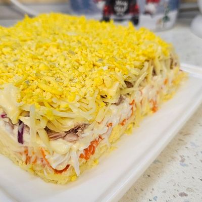 На дрібну терку натерти моркву, картоплю, окремо білок і жовток. 2. Замаринувати цибулю за цим рецептом. Маринована цибуля за 5 хвилин.