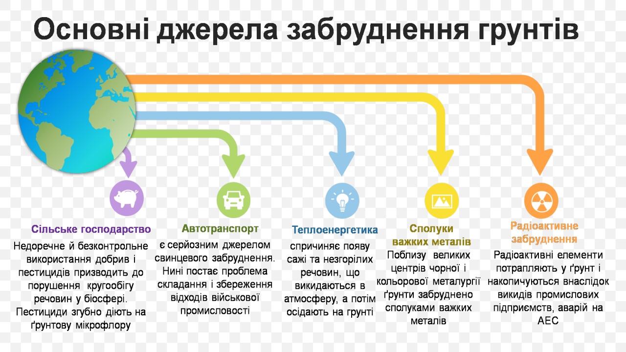 Основні джерела забруднення ґрунтів. Сільське господарство;Радіоактивні елементи;Сполуки важких металів;Автотранспорт;Теплоенергетика.