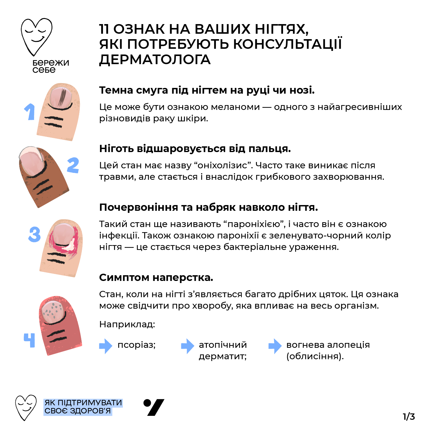 Жовтий або зелено-чорний колір нігтів, утворення під нігтями та стан, коли ніготь легко відходить від пальця – це ознака грибкової інфекції.