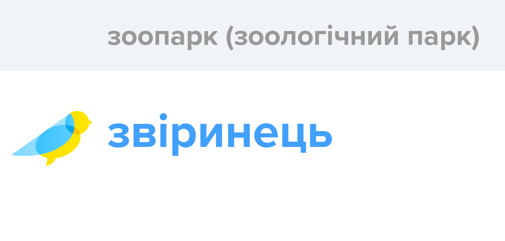 Зоопарк — територія, спеціально створена людиною, з будівлями і обладнанням для утримання, збереження … Найкращий переклад — Звіринець (45 голосів). Приклад …