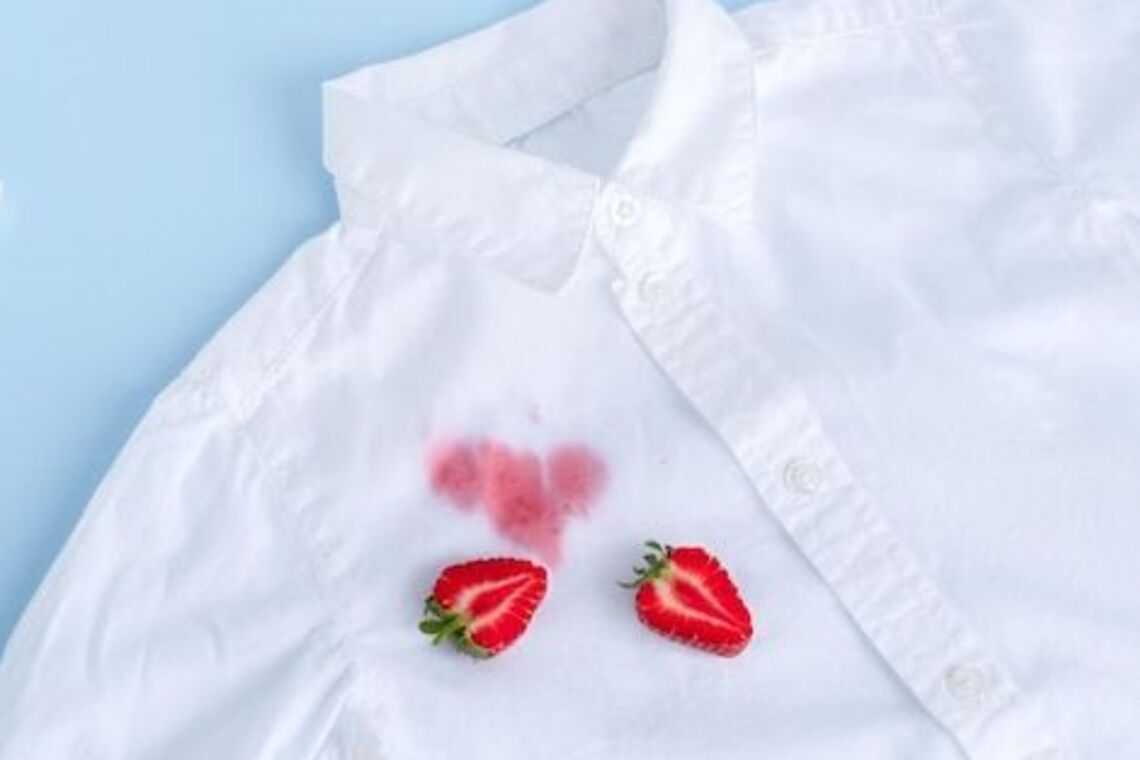 На 100 мл води потрібно взяти чайну ложку перекису водню (продається в аптеці), розмішати та нанести на пляму. За 5 хвилин від нього не залишиться слідів. Добре промити виріб і випрати з порошком. У такий спосіб виводять не лише свіжі, а й застарілі плями від полуниці та інших ягід.