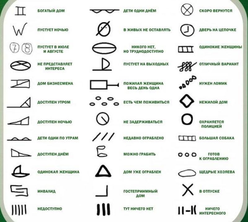 Щоб дізнатися, чи вдома господарі злодії встановлюють спеціальні мітки. Це може бути шматочок сірника/нитка/папірець у отворі дверей. Також перевіряють пил на ручці дверей, чи світиться у вікнах увечері світло. Також це можуть бути маленькі графічні позначення на стіні або двері.