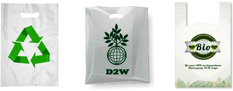 Справжні біорозкладні пакети. Для виробництва використовуються полімери. Щоб виріб розпався на вуглекислий газ та воду, мають бути створені певні умови. Так, за умови створення органічного компосту термін розкладання таких пакетів становить у середньому три місяці.