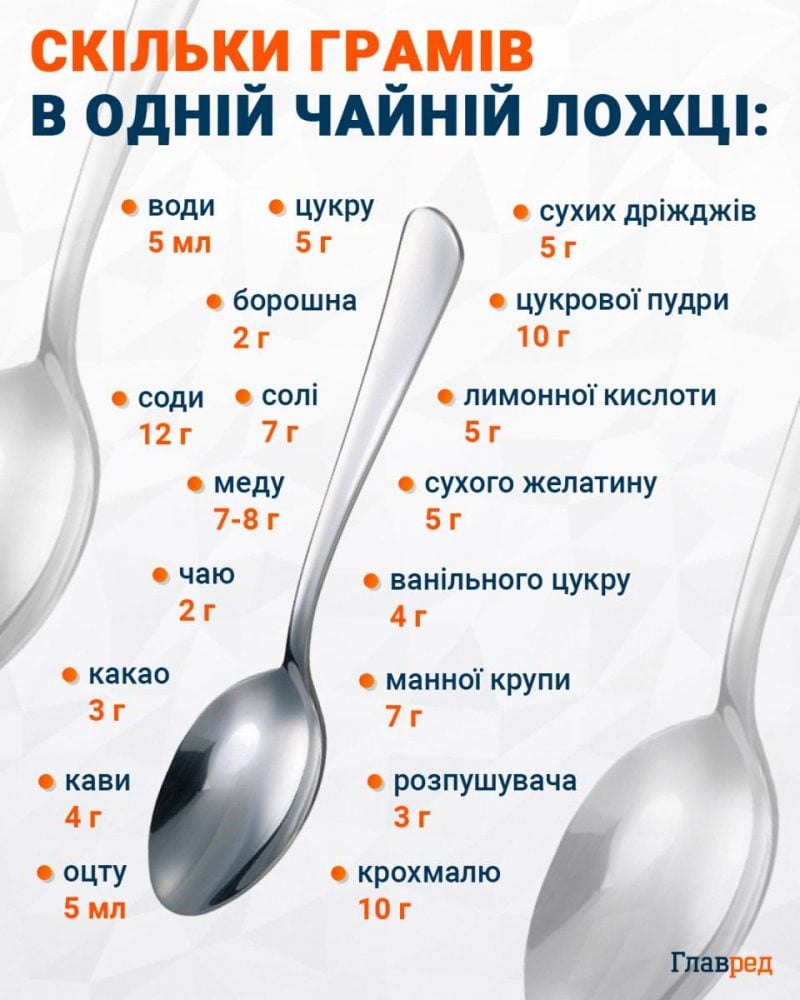 Як легко відміряти інгредієнти. У чайній ложці – 5 г, в столовій ложці – 15 г. ¼ чашки 250 мл – 60 г. ½ чашки 250 мл – 120 г. Ціла чашка 250 мл – 240 г.