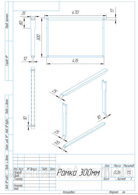Розміри: Верхня планка – ширина 25мм, товщина 15мм, довжина 470мм. Нижня планка – ширина 18мм, товщина 10 мм, довжина 435мм. Бічні планки – ширина 34(25)мм …