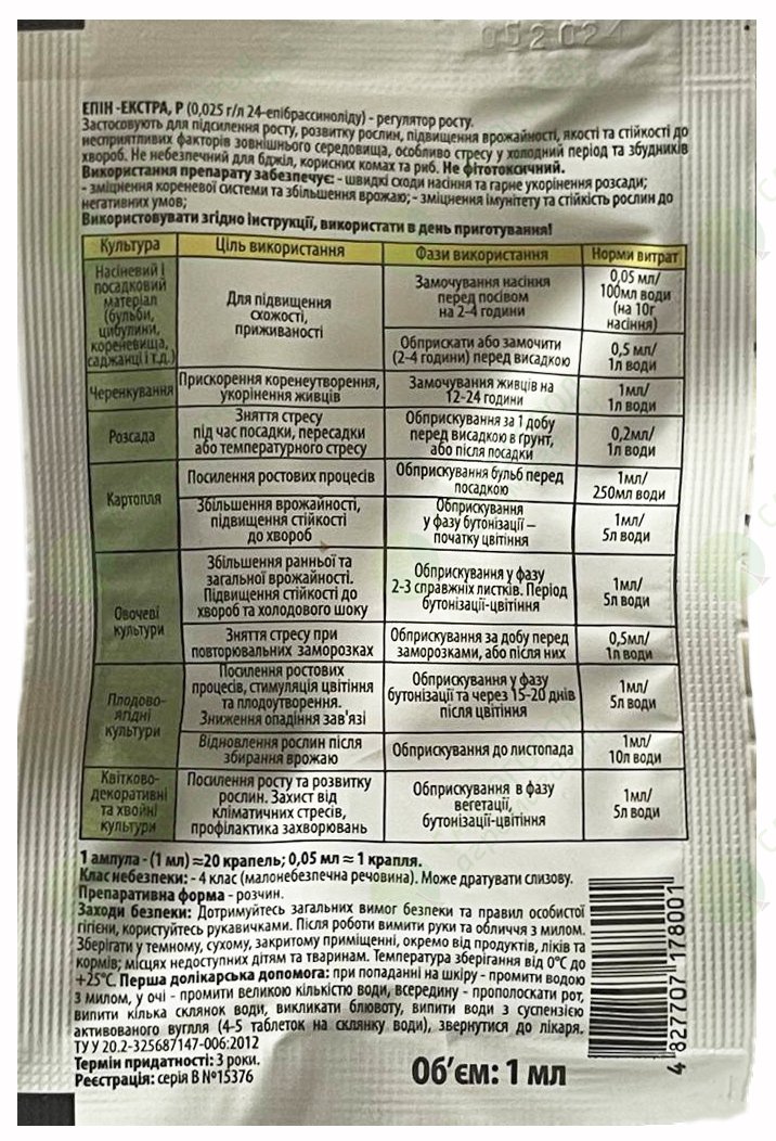 Використання Епін-екстра зазвичай 1 мл (1 ампула) епін-екстра на 5 л … Термін зберігання 3 роки з дати виготовлення. Характеристики. Помилка. Закрити …